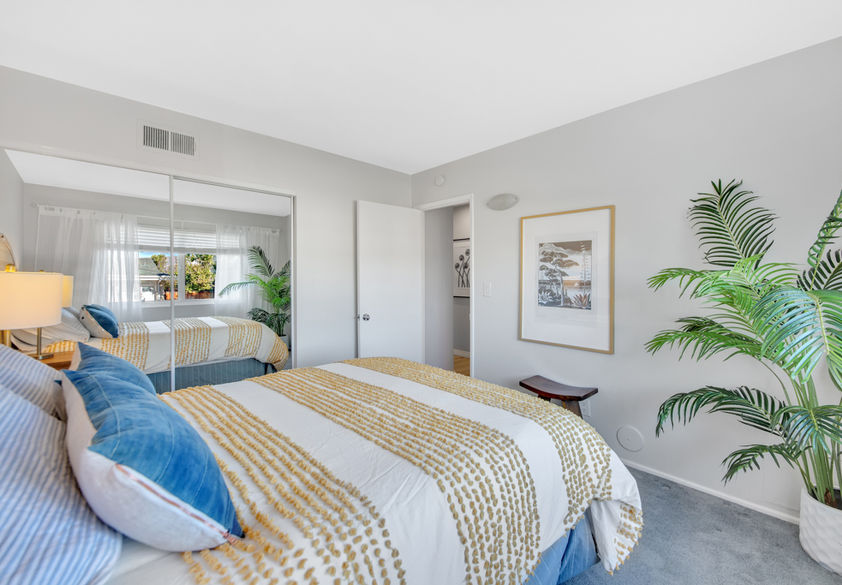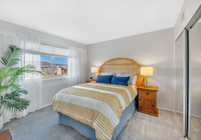 - The primary bedroom is a quiet corner of the house with vaulted ceilings, newly renovated bathroom and french doors leading out to the pool area.