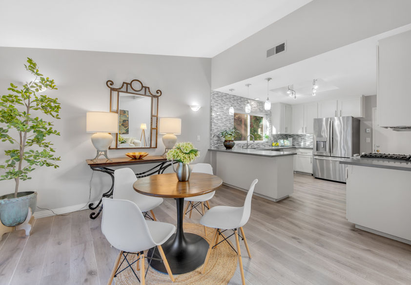 - The kitchen has been fully updated with quartz counters and stainless steel appliances, featuring a double sink, large window and convenient breakfast counter. The kitchen connects directly to the garage for easy grocery unloading, and connects to the dining area, which opens to the backyard via french doors.
